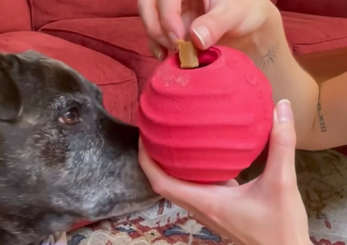 Before a stressful event like a storm, fireworks, or visitors, take your dog into a quiet room and create an interactive calming toy buy stuffing your Jolly Pets ball full of a few Edibites.