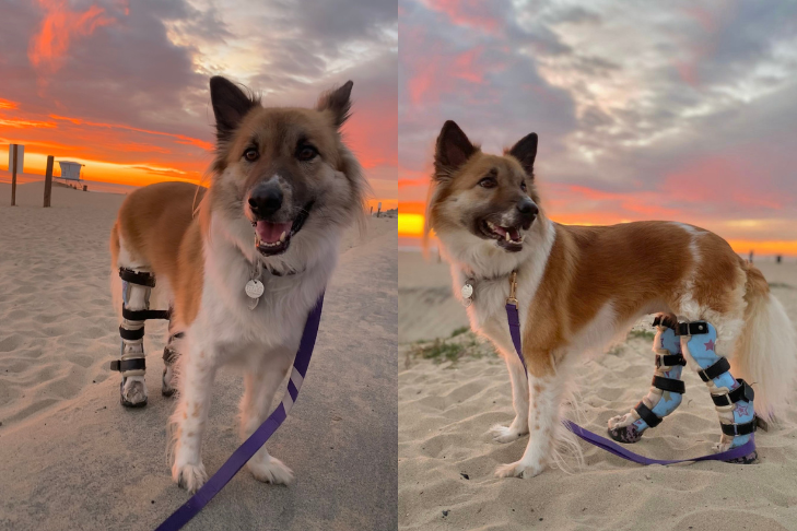 After walking Frida in a doggy wheelchair, we still felt that Frida had more ability than what the wheelchair could give her. After some unsuccessful attempts using braces, I reached out to Derrick Campana, dog prosthetics extraordinaire, from Disney Plus' "Wizard of Paws" TV show to see what he could do. It was COVID times, and traveling was limited, so my family and I decided to make the best of things and ended up on a cross-country RV road trip to meet Derrick. Frida was featured and fitted for her first set of WORKING prosthetic braces in December 2020, which forced her feet to a normal anatomic position, and now she can walk upright!