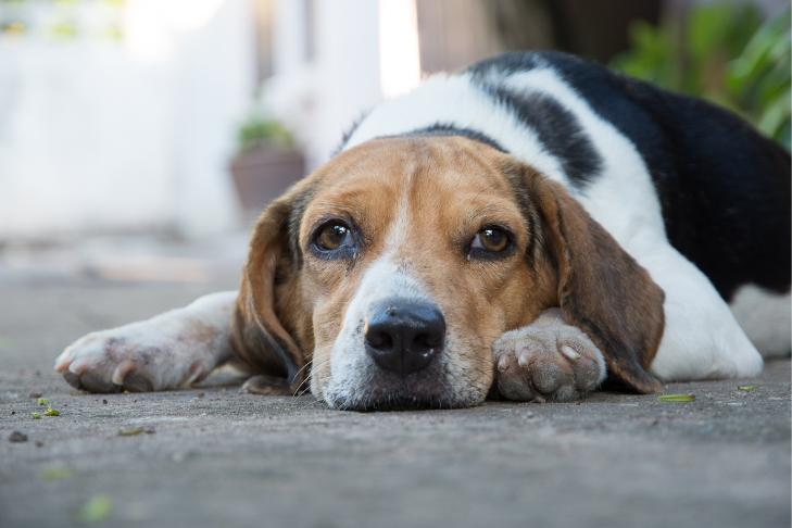 Certain postures can signal pain in dogs, like holding their head below their shoulders. Laying on their side is also one, but since that is common for dogs, it might be hard to use as a marker for pain. However, if they are hunched, with their hindquarters raised, and their front end on the ground, it may be time to call your vet because that position may indicate pain in their abdomen.