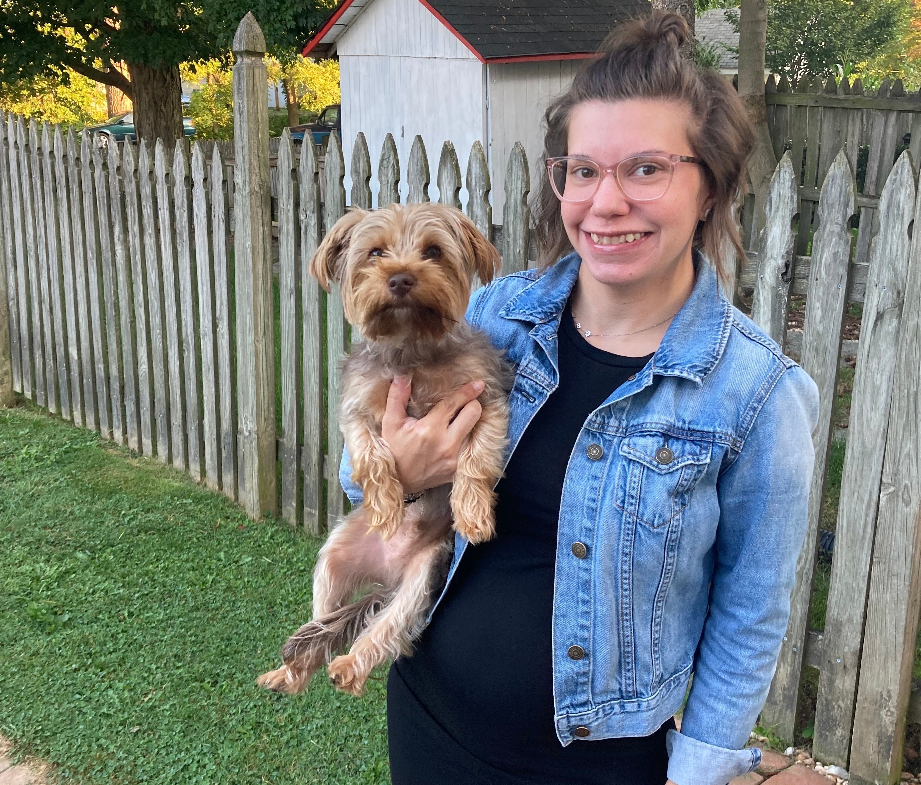 New mom Crystal Hout, holding her dog Billy. A Stress Releaf Edibites subscription helped Billy ease into life with his new human baby brother.