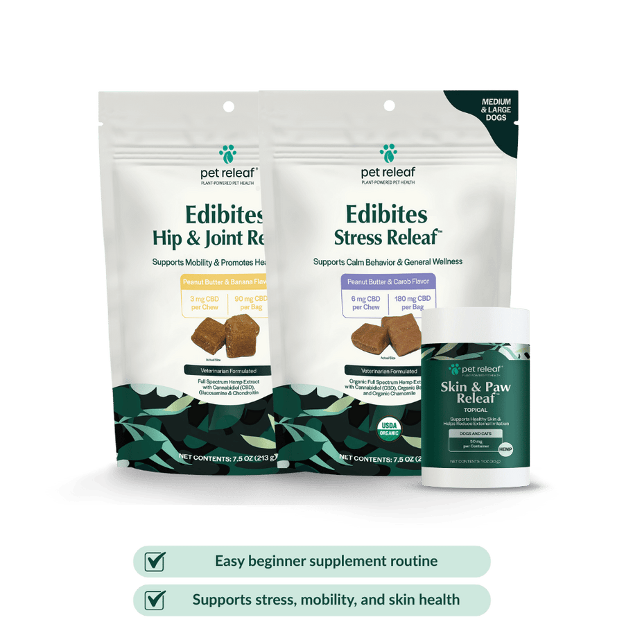 Not sure where to start? The Essential Supplement Routine for dogs bundles our best-selling Stress Releaf and Hip & Joint Edibites with our Skin & Paw Balm for simple, everyday dog care.