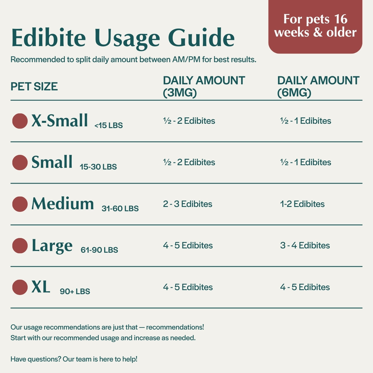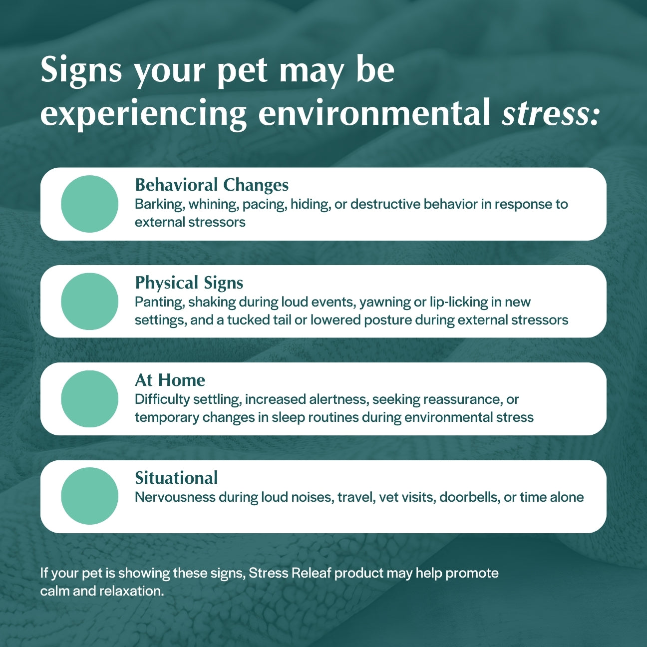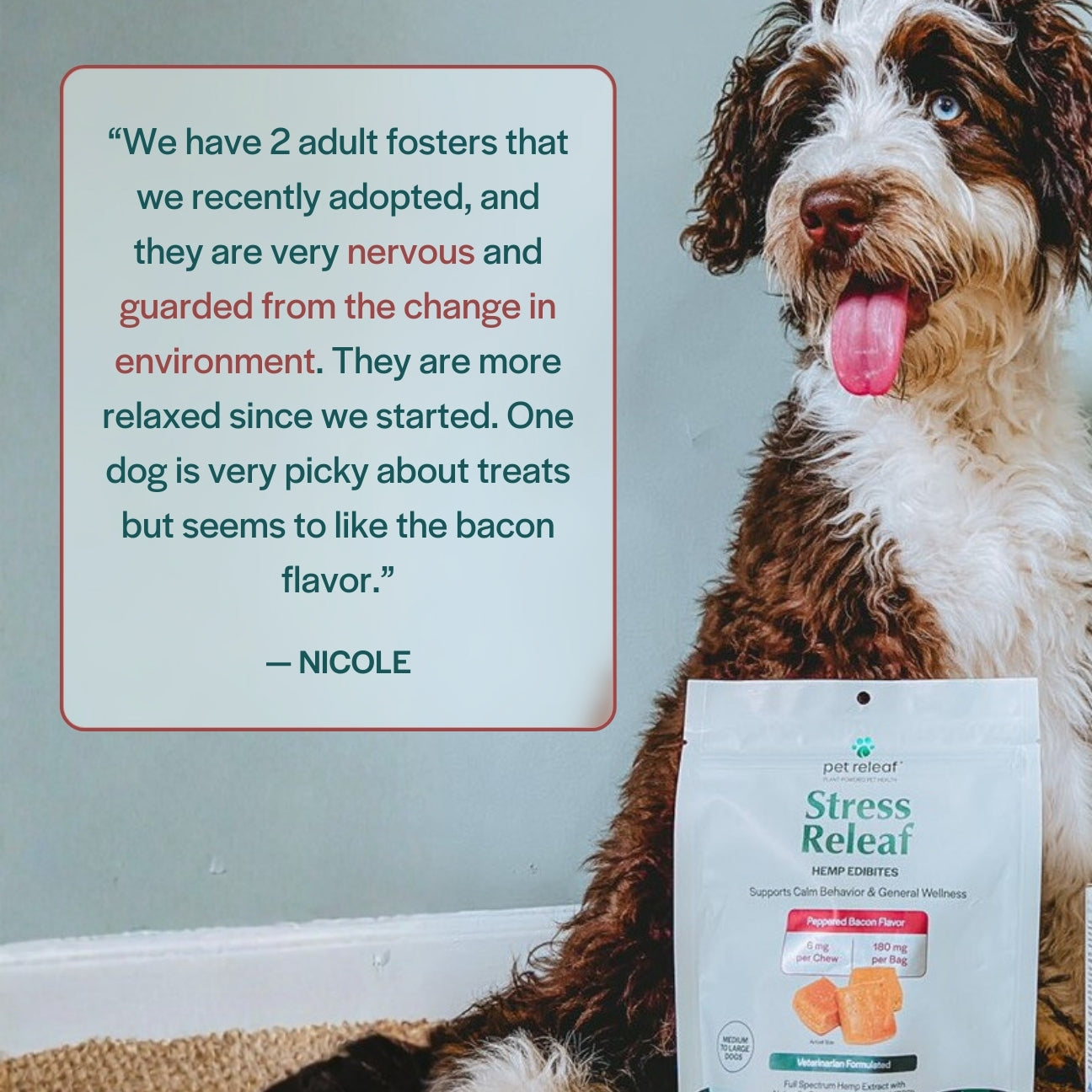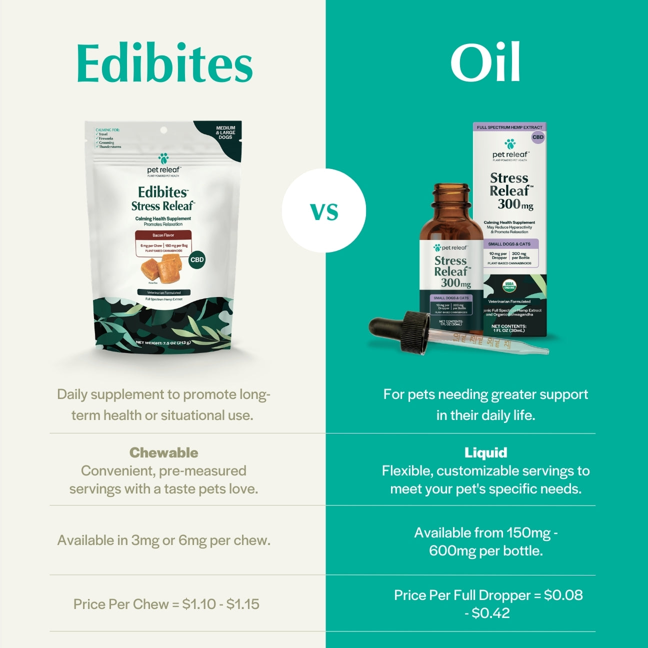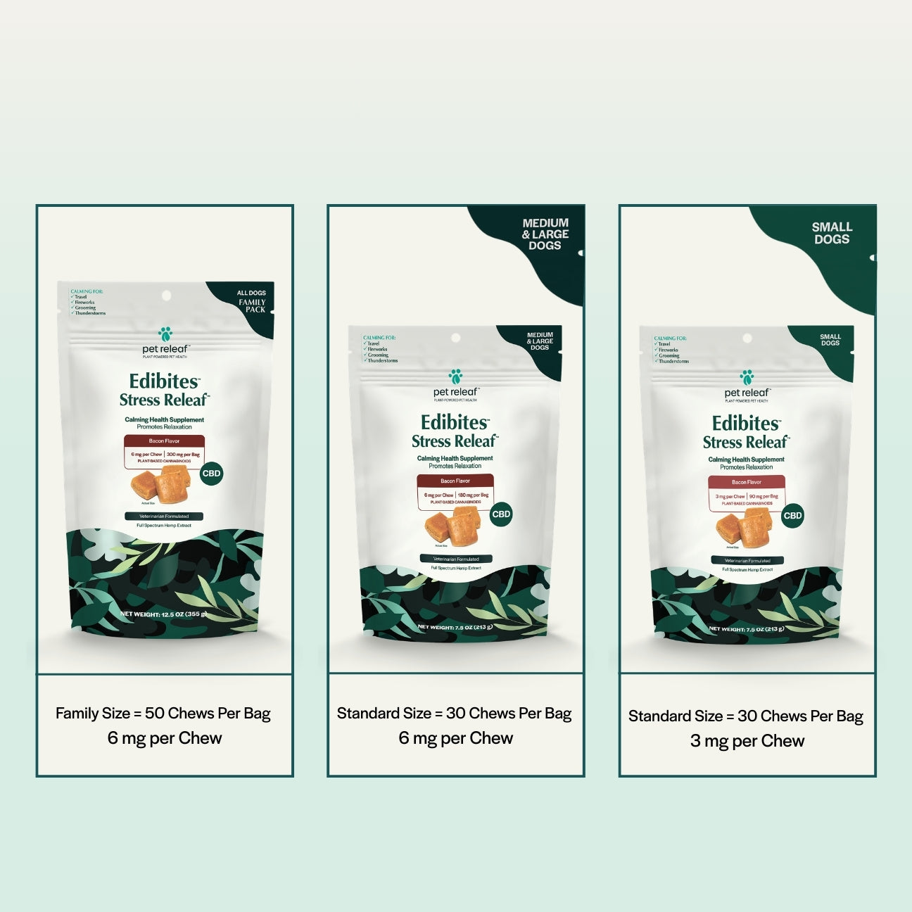 Stress Releaf Edibites provide meaningful calming support for dogs during common stress-inducing situations, such as unfamiliar visitors, loud events, or schedule changes. Each chew delivers a precise 3mg of CBD – ideal for smaller dogs that require gentle, targeted support. These soft, calming CBD chews for dogs promote relaxation without making your dog drowsy, helping them remain calm but still alert and connected to their surroundings.