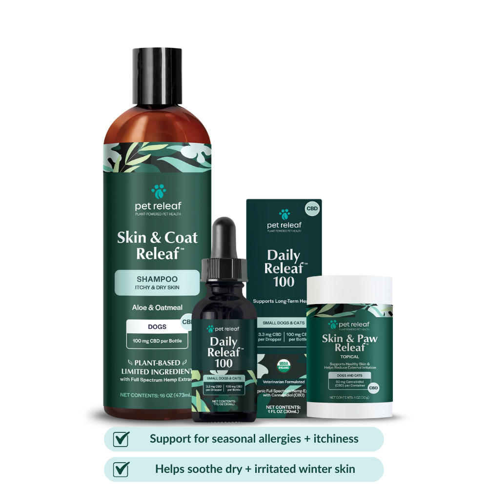 • Save 20% when you bundle our Itchy & Dry Skin Shampoo, Daily Releaf Oil, and Skin & Paw Releaf Topical