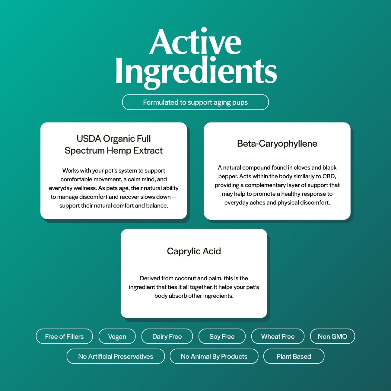 Our USDA Organic hemp extract is rich in CBD and other cannabinoids like CBC and CBG. Together, these compounds work in harmony to support healthy inflammatory processes and promote physical comfort for both active and aging dogs.