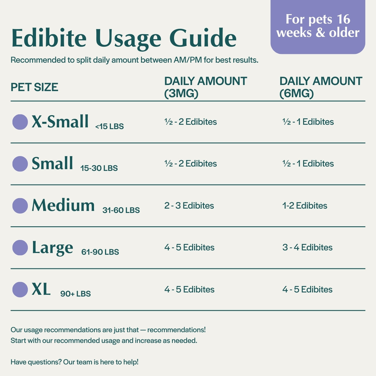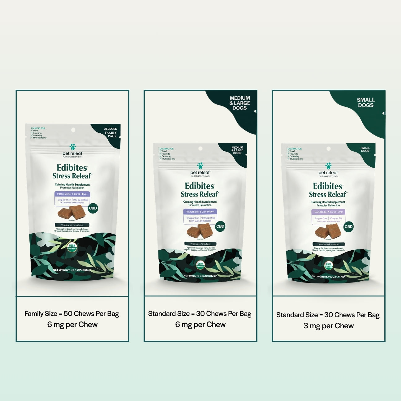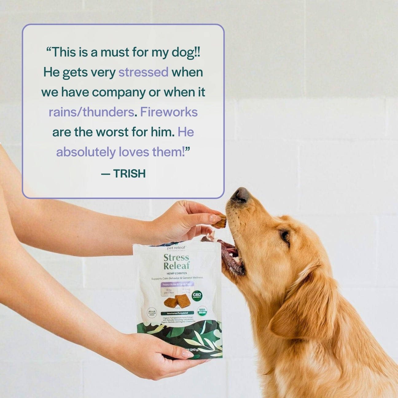 Stress Releaf Edibites provide meaningful calming support for dogs during common stress-inducing situations, such as unfamiliar visitors, loud events, or schedule changes. Each chew delivers a precise 3mg of CBD – ideal for smaller dogs that require gentle, targeted support. These soft, calming CBD chews for dogs promote relaxation without making your dog drowsy, helping them remain calm but still alert and connected to their surroundings.